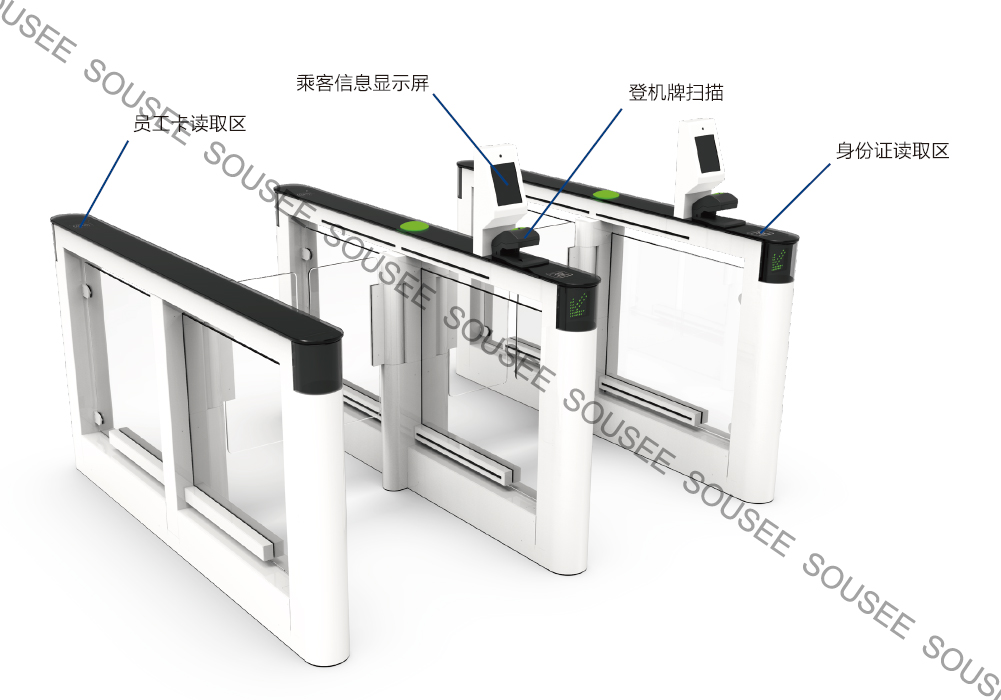 自助登机闸机:在旅客登机前增加与机场离港系统连接的自助登机查验系统,通过采集旅客面部信息验证是否通过安检检查以及是否属于当前航班,验证通过后自动放行旅客登机,实现刷脸登机; 亦可通过刷登机牌(纸质或电子)或旅客身份证件信息进行二次验证,验证通过后允许旅客登机。